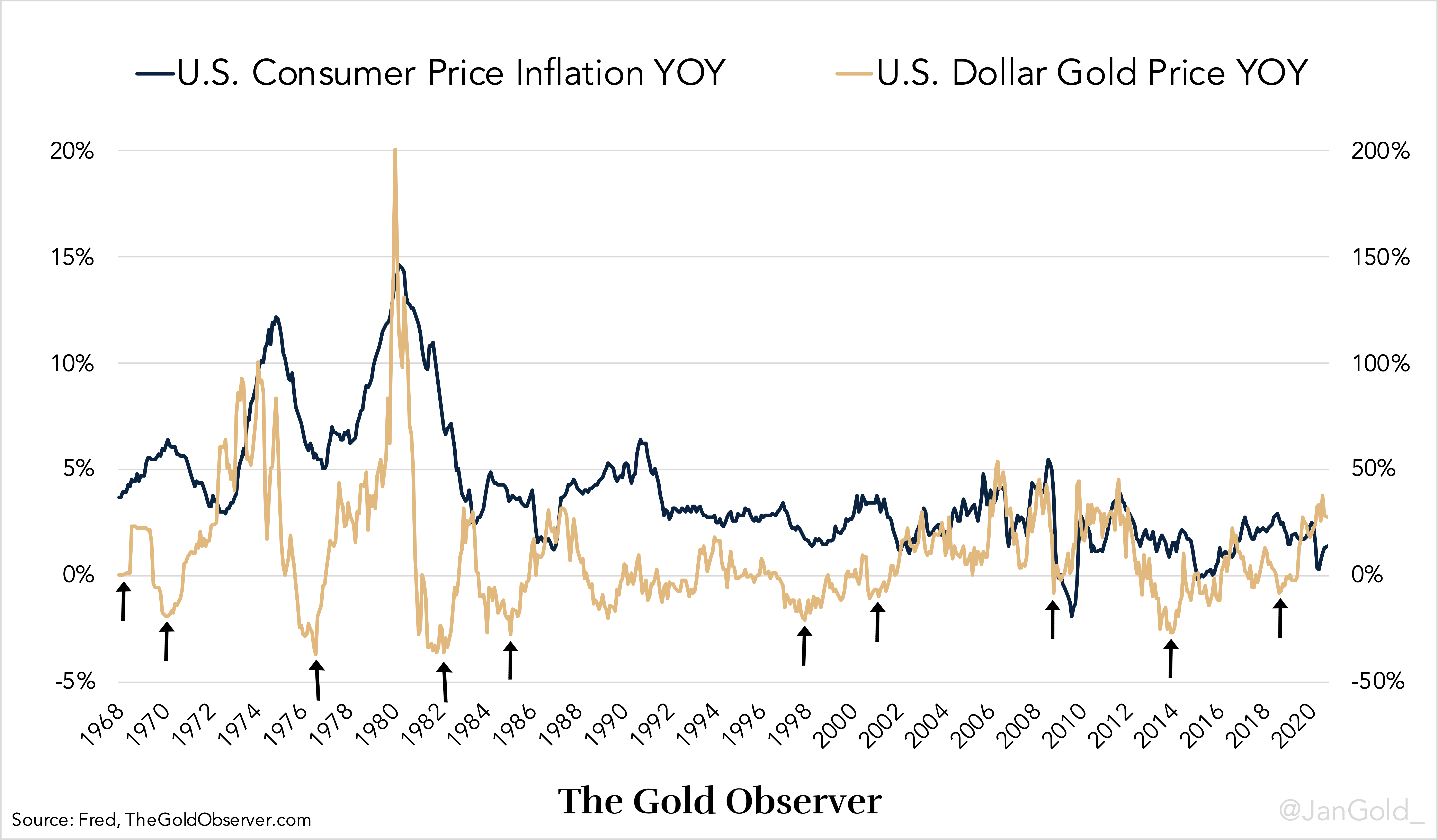 Strictly speaking, there is no economic law that guarantees that a higher gold price will create inflation. Though, historically the gold price has been an expression of inflation expectations. In turn, inflation expectations are what feed into inflation. So, when the gold price goes up, inflation usually rises within a year or two (see the chart below).